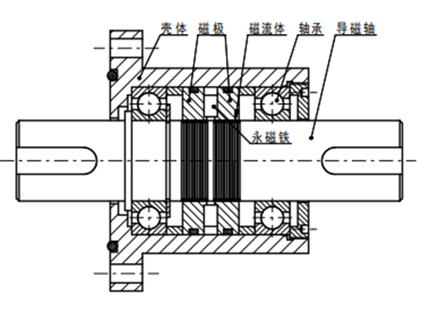 磁流體密封裝置的功能是把旋轉(zhuǎn)運(yùn)動(dòng)傳遞到密封容器內(nèi),常用于真空密封,其基本原理見下圖: